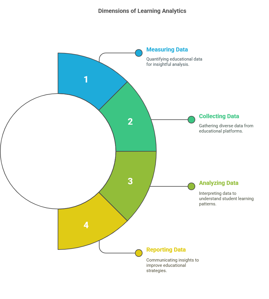 1. Data Collection: Learning Analytics uses data from various sources such as Learning Management Systems (LMS), online assessments, interaction logs, and other digital tools used in education. It includes information on students’ performance, participation, and behaviors.