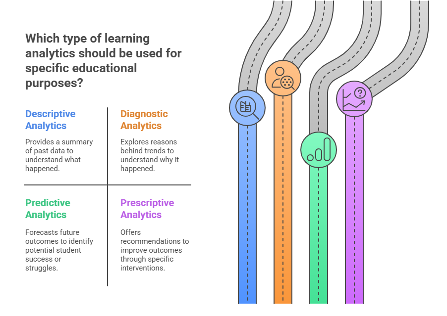 3. Predictive Analytics: Uses historical data and patterns to forecast future outcomes, such as identifying students likely to succeed or struggle.