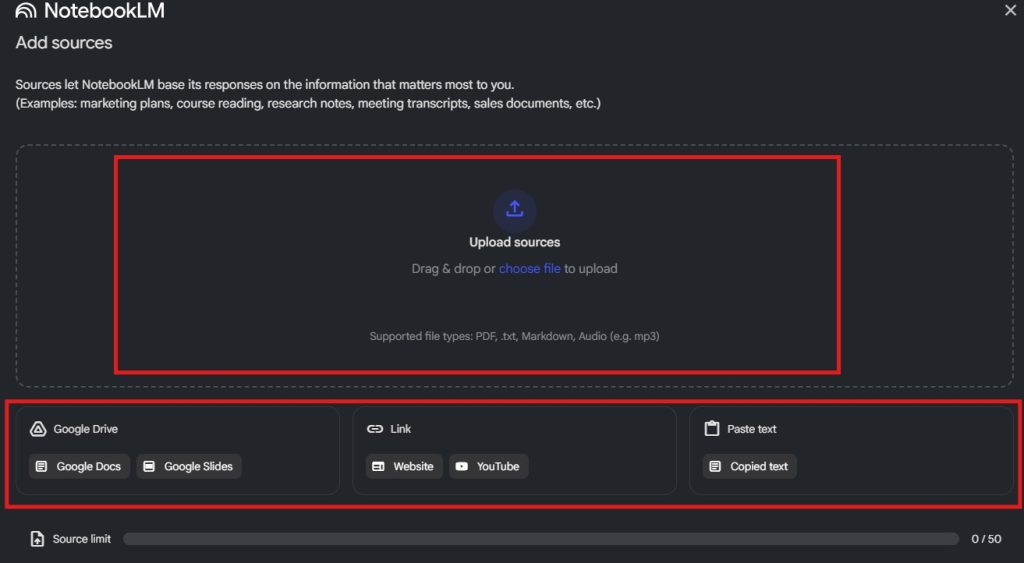 NotebookLM allows you to upload various source materials to serve as references for AI-driven note-taking and summarization.