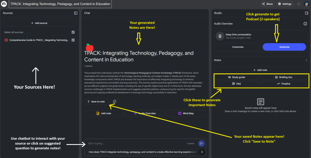 Once your sources are uploaded, NotebookLM provides AI-powered summaries and insights. Here’s how to interact with them:
