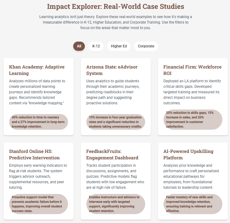 Real-Life Example (Corporate): Workforce Development and ROI. In the corporate sector, a leading financial services organization successfully deployed a learning analytics platform to address challenges in workforce development.20 This platform was used to identify critical skills gaps and knowledge deficiencies across the organization. Based on these insights, targeted training programs were developed to address specific business needs. Crucially, the platform also measured the direct impact of this training on key business outcomes, such as sales performance and customer satisfaction. The results were substantial, including a 25% reduction in skills gaps, a 15% increase in sales performance among trained employees, and a 20% improvement in customer satisfaction ratings.20 This demonstrates how learning analytics can also predict employee turnover and identify at-risk employees, further optimizing human capital strategies.20 This application of learning analytics provides a quantitative basis for high-level institutional and corporate decisions.2 It is vital for accountability to stakeholders and for demonstrating the tangible value of educational investments. By measuring the impact of training on business outcomes 20 or graduation rates 10, learning analytics shifts the conversation from qualitative assumptions to data-backed evidence, enabling more strategic resource allocation and a clearer return on investment for educational programs.